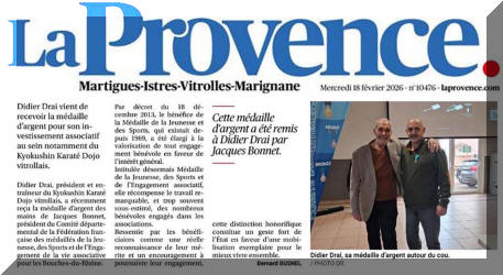 Félicitations à Didier Drai Sensei (KD Vitrolles) qui s'est vu décerner la médaille d'argent de la Jeunesse et des Sports et de l'engagement associatif.