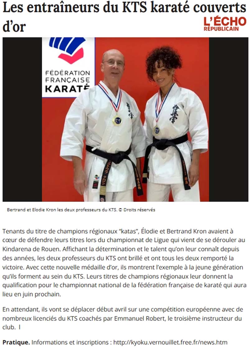 Championnat de France Kata  (niveau sélectif régional) avec un doublé de médailles d'or pour Elodie et Bertrand Kron (KTS Vernouillet-Pays drouais) et l'accès au National pour la 6e année consécutive.
