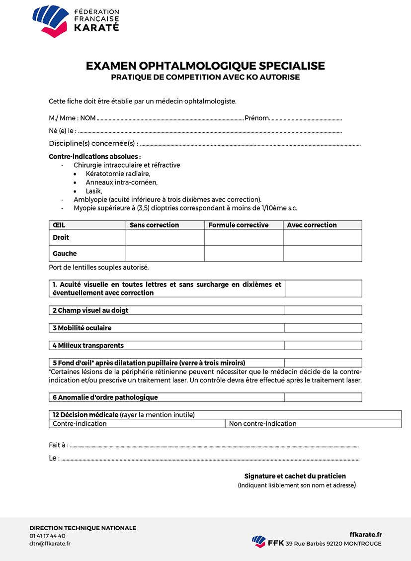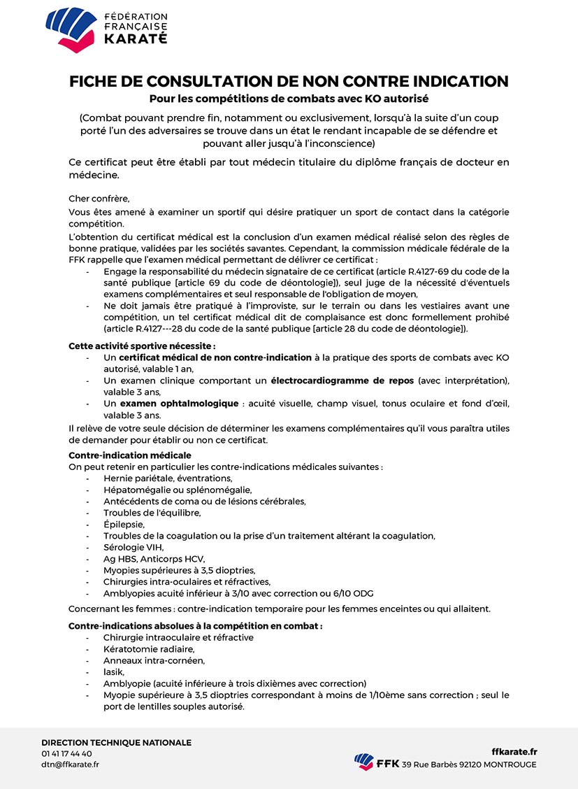 Nouveau certificat médical de non contre indication aux sports de combat avec KO autorisé en seniors, comportant un électrocardiogramme de repos interprété, un examen ophtalmologique avec acuité et champ visuel, tonus oculaire et fond d'œil.