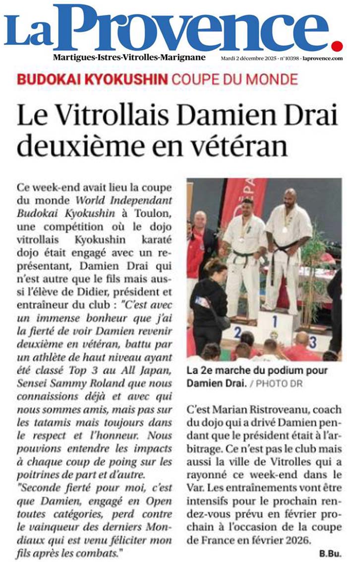 FKOK Monde - Championnat du Monde Kyokushin WIBK en France, avec une médaille d'argent pour Damien Drai (KKD Vitrolles, Branch-Chief Didier Drai Sensei), et les honneurs de la presse régionale.