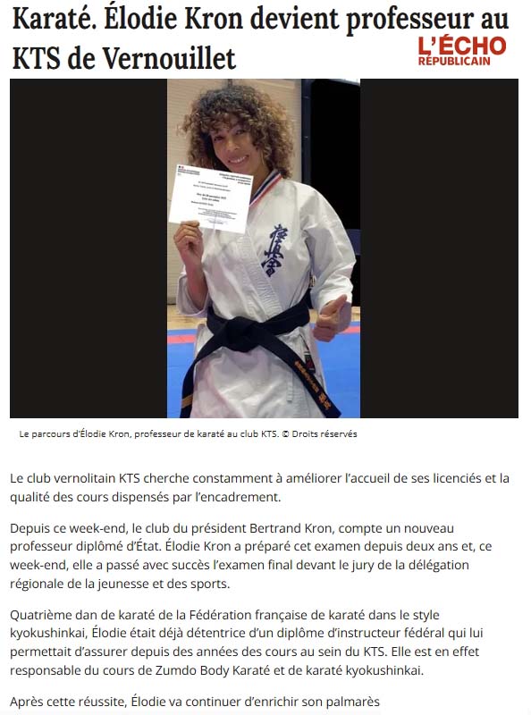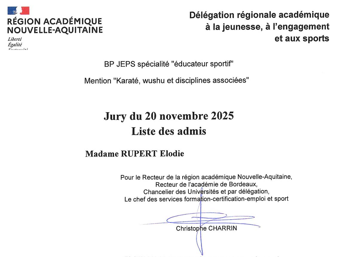 Félicitations à Elodie Kron Sensei (KTS Vernouillet) qui décroche avec succès son diplôme de professeur de Karaté du ministère des Sports (BPJEPS).