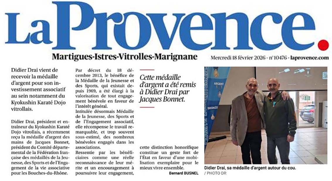 Félicitations à Didier Drai Sensei (KD Vitrolles) qui s'est vu décerner la médaille d'argent de la Jeunesse et des Sports et de l'engagement associatif.
