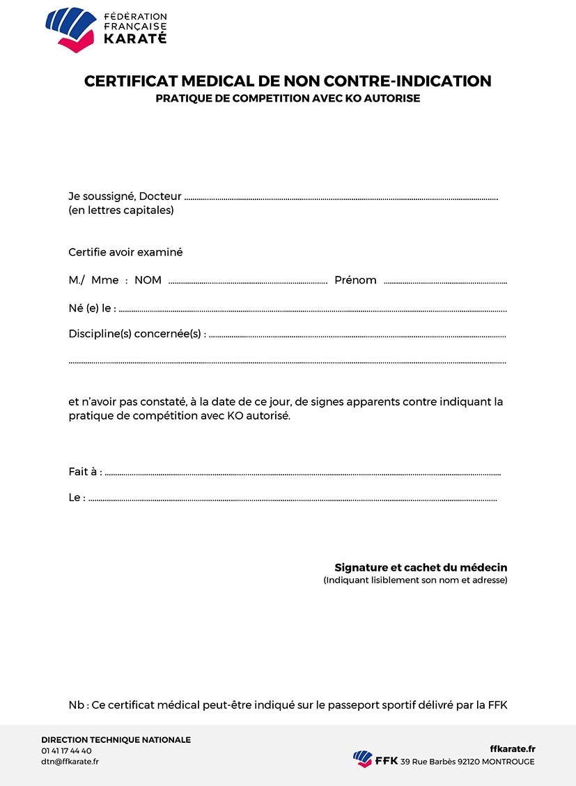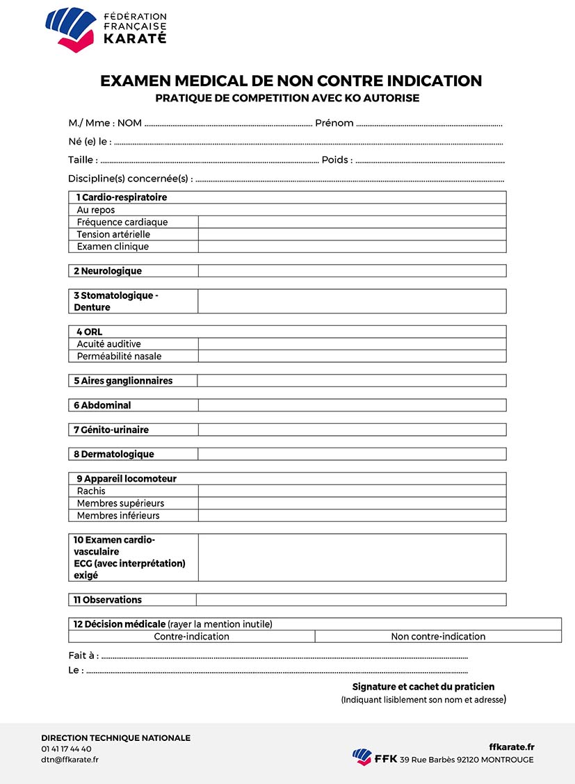 Nouveau certificat médical de non contre indication aux sports de combat avec KO autorisé en seniors, comportant un électrocardiogramme de repos interprété, un examen ophtalmologique avec acuité et champ visuel, tonus oculaire et fond d'œil.